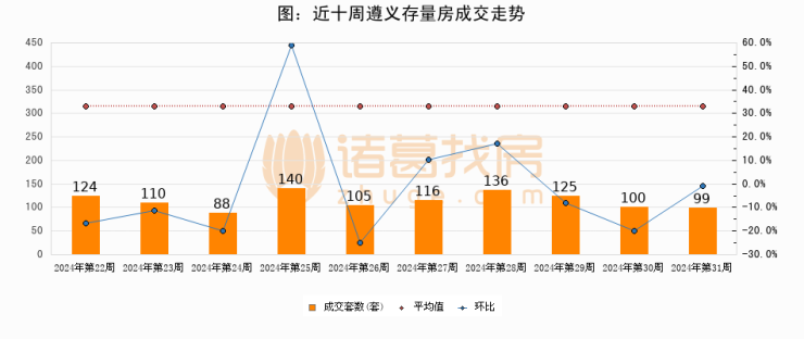 存量房方面,第31周遵义存量房成交99套,较上周减少1套,环比下降1%。从近十周成交走势来看,周均成交套数为114套,本周低于平均水平13.2%。