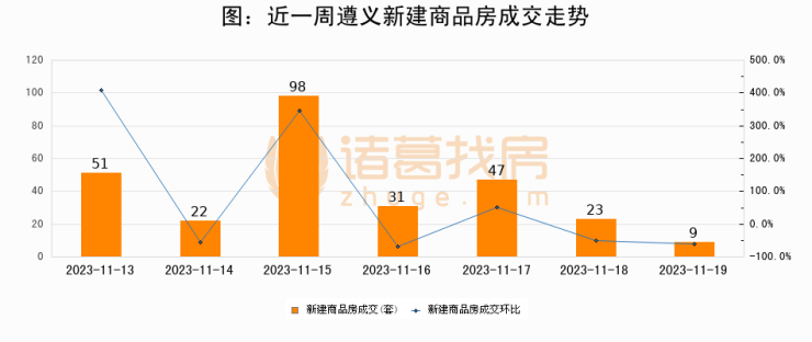根据遵义市住房和城乡建设局数据显示,2023年11月19日遵义新建商品房成交9套,较昨日减少14套,环比下降60.9%