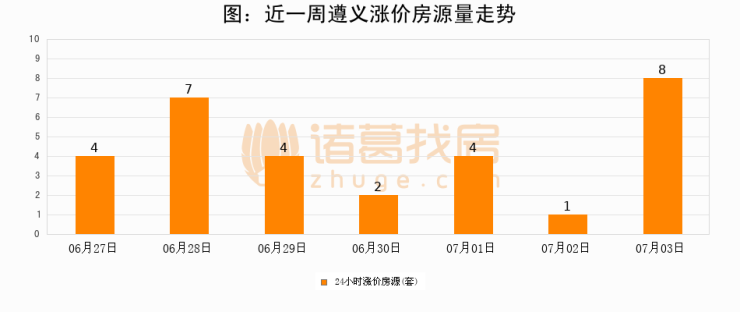 根据诸葛找房数据显示,遵义24小时涨价房源量为8套,较07月02日增加7套,环比上涨700%。与此同时,涨价房源占比小幅扩大,业主信心有所提升。