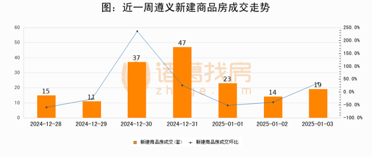 根据遵义市住房和城乡建设局数据显示,2025年01月03日遵义新建商品房成交19套,较昨日增加5套,环比上涨35.7%