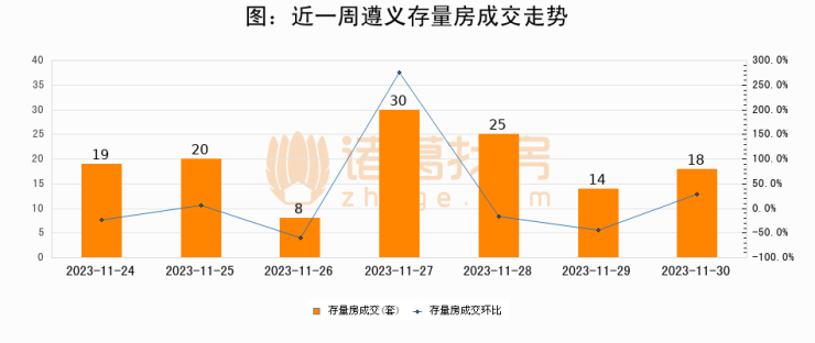 从存量房来看,2023年11月30日遵义存量房单日成交18套,比昨日增加4套,环比上涨28.6%。从近一周存量房成交来看,遵义存量房日均成交套数为19套,11月30日单日成交18套,低于近一周平均水平5.3%。