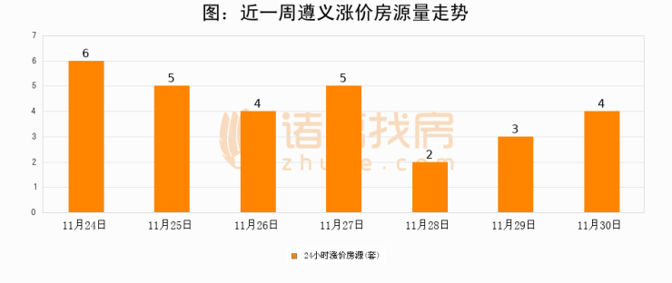 根据诸葛找房数据显示,遵义24小时涨价房源量为4套,较11月29日增加1套,环比上涨33.3%。与此同时,涨价房源占比小幅扩大,业主信心有所提升。