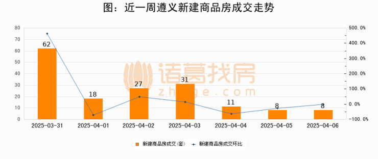 根据遵义市住房和城乡建设局数据显示,2025年04月06日遵义新建商品房成交8套,较昨日持平
