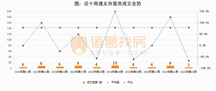 存量房方面,第33周遵义存量房成交3套,较上周减少6套,环比下降66.7%。从近十周成交走势来看,周均成交套数为6套,本周低于平均水平50%。