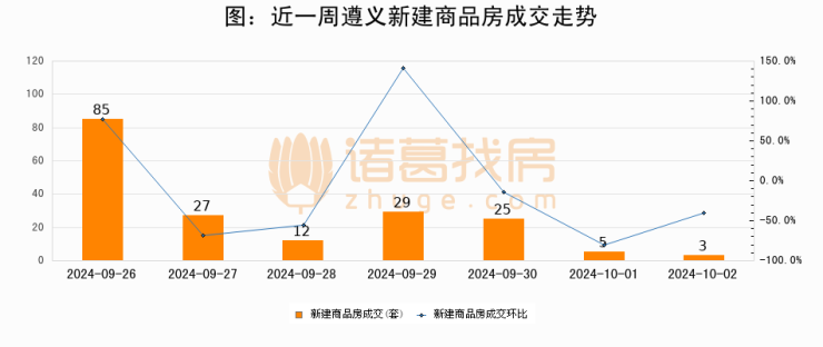 根据遵义市住房和城乡建设局数据显示,2024年10月02日遵义新建商品房成交3套,较昨日减少2套,环比下降40%