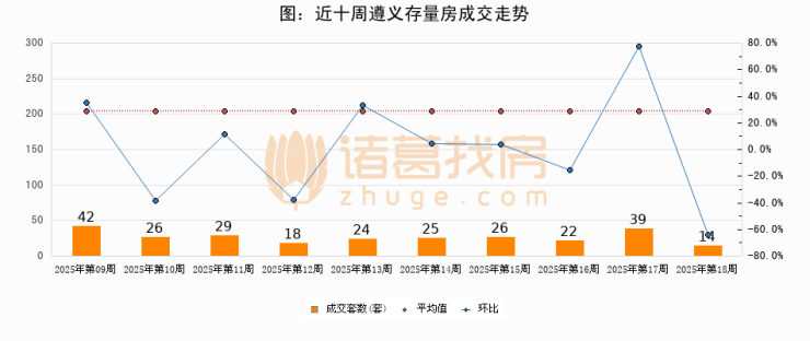 存量房方面,第18周遵义存量房成交14套,较上周减少25套,环比下降64.1%。从近十周成交走势来看,周均成交套数为26套,本周低于平均水平46.2%。