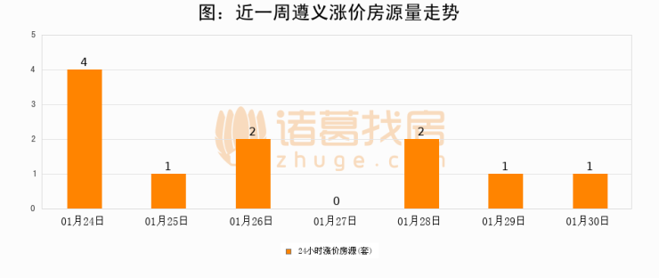 根据诸葛找房数据显示,遵义24小时涨价房源量为1套,较01月29日持平。