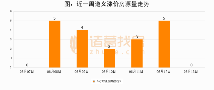 根据诸葛找房数据显示,遵义24小时涨价房源量为0套,较06月12日减少5套,环比下降100%。与此同时,涨价房源占比小幅回落,对于购房者来说是一个入市窗口期,购房者可抓住时机入市。