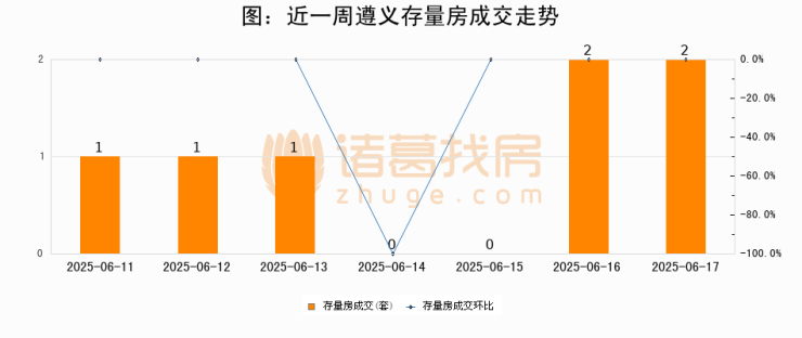 从存量房来看,2025年06月17日遵义存量房单日成交2套,比昨日持平。。从近一周存量房成交来看,遵义存量房日均成交套数为1套,06月17日单日成交2套,高于近一周平均水平100%。