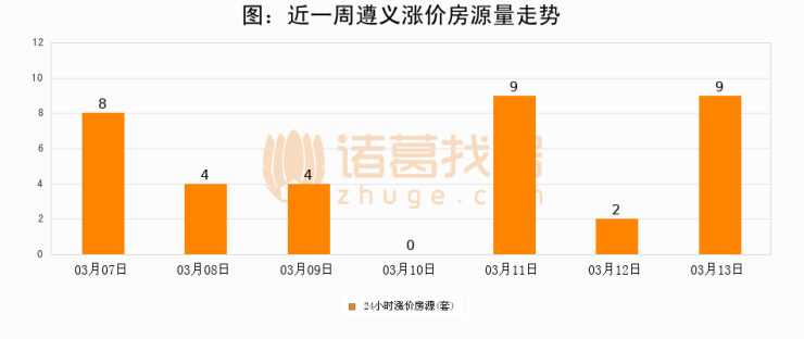 根据诸葛找房数据显示,遵义24小时涨价房源量为9套,较03月12日增加7套,环比上涨350%。与此同时,涨价房源占比小幅扩大,业主信心有所提升。