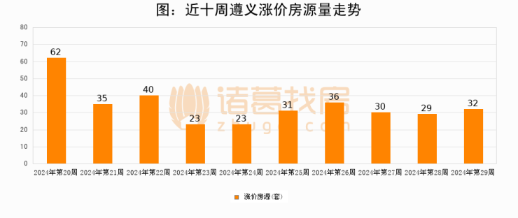 从调价房源来看,第29周遵义涨价房源32套,较上周上涨10.3%。与此同时,29周涨价房源占比回落0.26个百分点,业主信心小幅波动,购房者可则需入市。