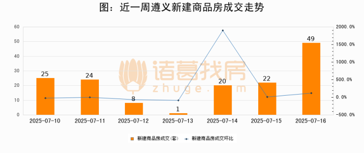 根据遵义市住房和城乡建设局数据显示,2025年07月16日遵义新建商品房成交49套,较昨日增加27套,环比上涨122.7%