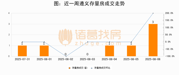 从存量房来看,2025年08月06日遵义存量房单日成交3套,比昨日增加2套,环比上涨200%。从近一周存量房成交来看,遵义存量房日均成交套数为1套,08月06日单日成交3套,高于近一周平均水平200%。