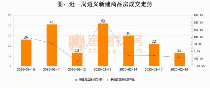 根据遵义市住房和城乡建设局数据显示,2025年02月16日遵义新建商品房成交13套,较昨日减少9套,环比下降40.9%。近一周遵义新建商品房日均成交27套。02月16日单日成交13套,低于近一周平均水平51.9%。