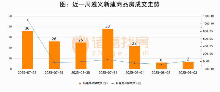 根据遵义市住房和城乡建设局数据显示,2025年08月03日遵义新建商品房成交7套,较昨日增加1套,环比上涨16.7%