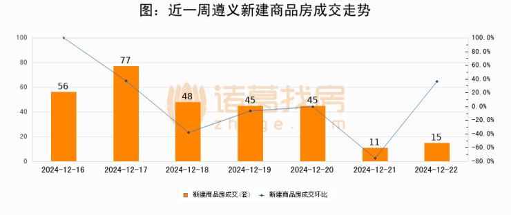 根据遵义市住房和城乡建设局数据显示,2024年12月22日遵义新建商品房成交15套,较昨日增加4套,环比上涨36.4%